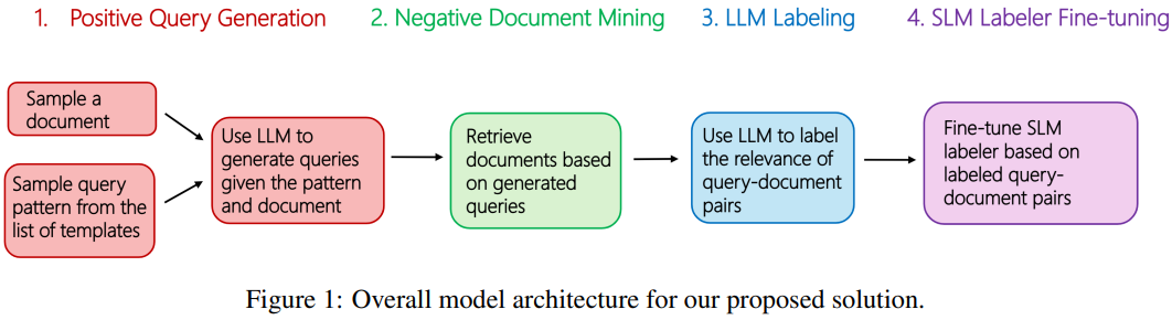 This paper from Microsoft addresses the challenge of relevance labeling in enterprise search, a domain that differs significantly from web search due to ambiguous, context-dependent queries that rely on organizational knowledge rather than general semantics. The authors propose a synthetic data generation pipeline that fine-tunes Phi-3.5 Mini Instruct (a small language model) to perform relevance labeling at scale without requiring expensive human annotations or LLM inference. The pipeline works in four stages: generating positive queries from enterprise documents using GPT-4o with metadata-based templates, mining hard negatives via BM25 retrieval, obtaining relevance labels (0-4 scale) from GPT-4o, and fine-tuning the SLM on the resulting triplets along with public datasets for improved generalization. Evaluated on 923 human-annotated enterprise query-document pairs, the fine-tuned SLM achieves NDCG of 0.953 and pairwise accuracy of 63.81%, slightly outperforming GPT-4o (0.944 NDCG, 62.58% accuracy) while delivering 17× higher throughput (873 RPM on a single A100) and 19× lower cost.