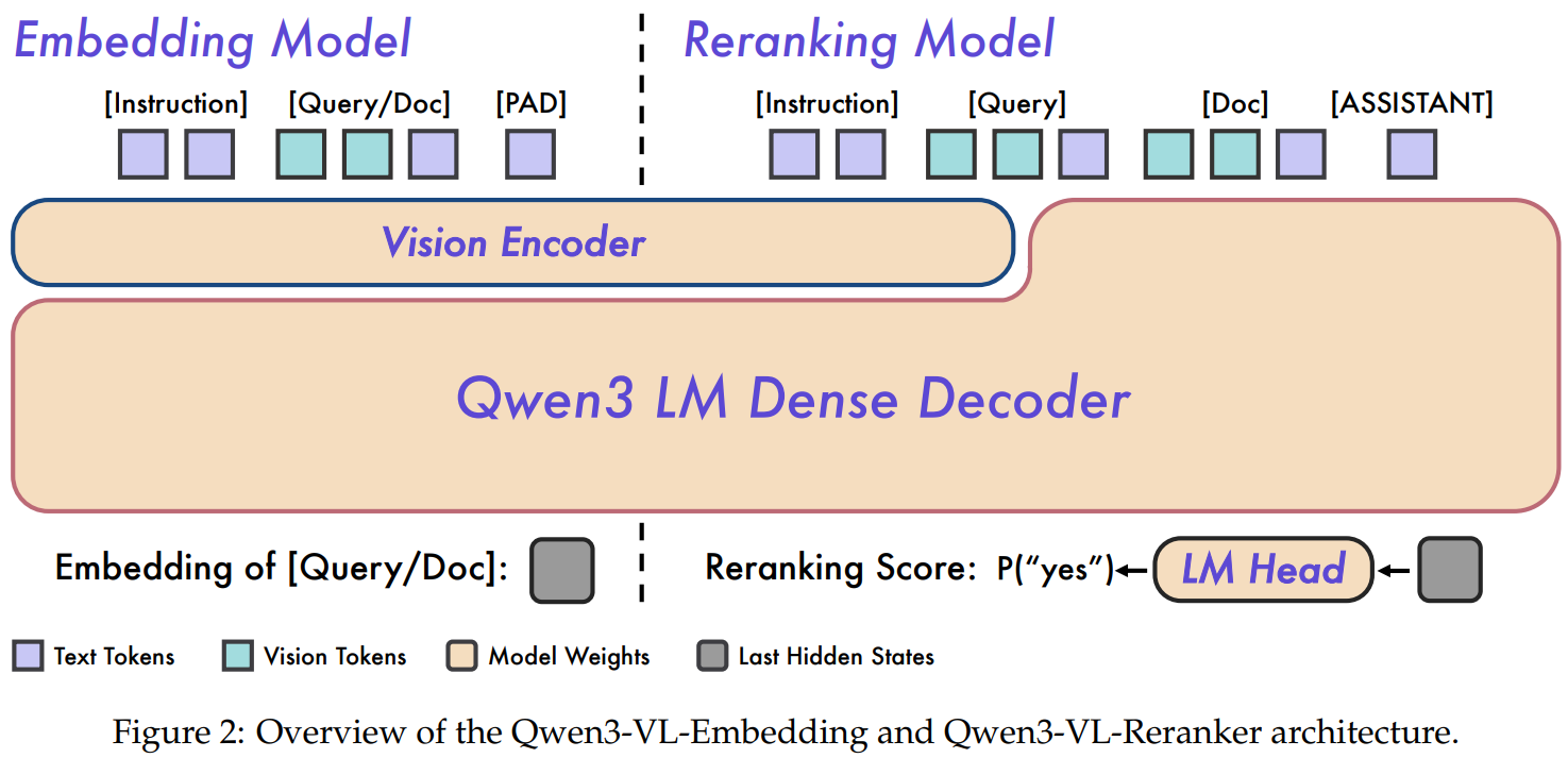 This technical report from Alibaba presents Qwen3-VL-Embedding and Qwen3-VL-Reranker, a pair of multimodal retrieval models built on the Qwen3-VL vision-language foundation model, released in 2B and 8B parameter sizes. The embedding model uses a bi-encoder architecture to map text, images, visual documents, and video into a unified representation space, while the reranker employs a cross-encoder that performs deep cross-attention between query-document pairs for fine-grained relevance scoring (outputting P("yes") as the relevance score). Training follows a three-stage pipeline: (1) contrastive pre-training on 300M synthesized multimodal samples using InfoNCE loss, (2) multi-task contrastive learning on 40M curated samples with task-specific losses, and (3) knowledge distillation from the reranker into the embedding model, followed by model merging to balance retrieval versus classification/QA performance. Key practical features include Matryoshka Representation Learning for flexible embedding dimensions without retraining, quantization-aware training via Learned Step Size Quantization for int8 deployment, 32K token context length, and support for 30+ languages. On MMEB-V2, Qwen3-VL-Embedding-8B achieves 77.8 overall (SOTA as of January 2026), with particularly strong results on image (80.1), video (67.1), and visual document (82.4) domains; the 8B reranker further improves retrieval tasks by 4.1 points over the 2B variant.