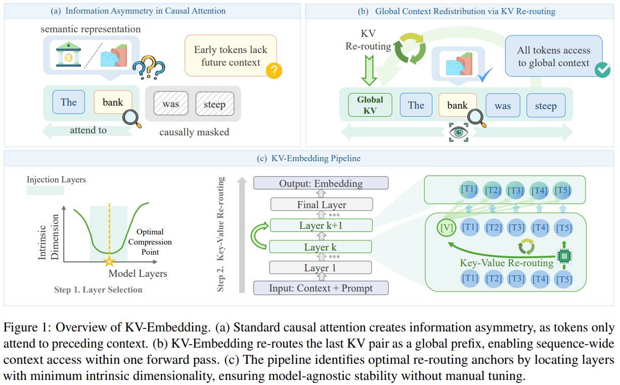 This paper from HKUST presents KV-Embedding, a training-free framework for extracting text embeddings from decoder-only LLMs that addresses two limitations of causal attention: early tokens cannot access subsequent context (information asymmetry), and the final token is biased toward next-token prediction rather than semantic compression. The method works by extracting the key-value states of the final token at selected layers, which naturally encode a compressed view of the entire sequence due to causal attention’s accumulation pattern, and prepending them as a virtual prefix, allowing all tokens to attend to this global summary within a single forward pass. To determine which layers should receive this KV re-routing, the authors use intrinsic dimensionality analysis to identify layers where representations exhibit maximal semantic compression (minimum ID), avoiding interference with shallow feature extraction or late-layer prediction heads. Combined with a compression-oriented prompt template, this approach achieves state-of-the-art results among training-free methods on MTEB benchmarks across Qwen3-4B, Mistral-7B, and Llama-3.1-8B backbones, outperforming alternatives like Echo (which doubles sequence length through repetition) and token prepending (which uses out-of-vocabulary tokens) by up to 10%.